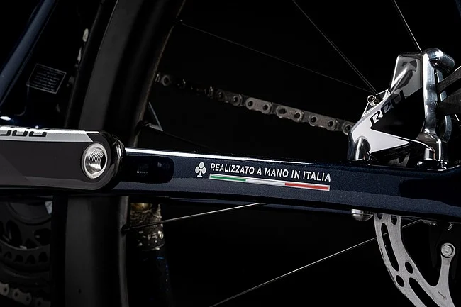 Der Rahmen besteht aus mehreren Carbonteilen, die in Italien von Hand durch Verbindungen und Verriegelungen zusammengefügt werden.